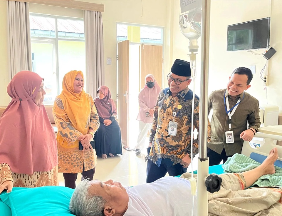 Kakanwil Kemenhaj Sumut Zulkifli Sitorus didampingi Kabag TU Alfian membesuk Calhaj asal Jawa Tengah yang dirawat di RSUD Lubuk Pakam, Jumat (24/4/2026).