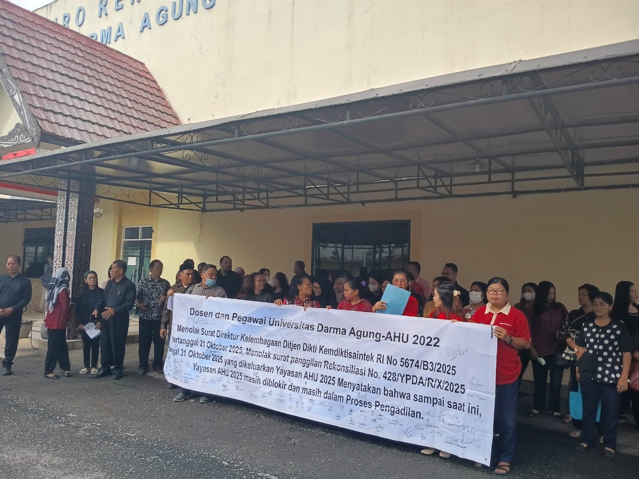MEDAN : Puluhan dosen dan pegawai Universitas Darma Agung (UDA) Medan menggelar aksi demo di depan Gedung Rektorat, Jl. Dr. TD Pardede No. 21 Medan, Selasa (4/11/2025) pagi. Aksi dimulai pukul 08.00 WIB setelah apel dan ibadah rutin yang biasa dilakukan sivitas akademika kampus tersebut. Pantauan wartawan puluhan peserta aksi yang terdiri dari tenaga pendidik dan kependidikan UDA menyuarakan penolakan terhadap Surat Panggilan Rekonsiliasi No. 428/YPDA/R/X/2025 yang diduga dikeluarkan pihak Yayasan UDA versi HNK pada 31 Oktober 2025.