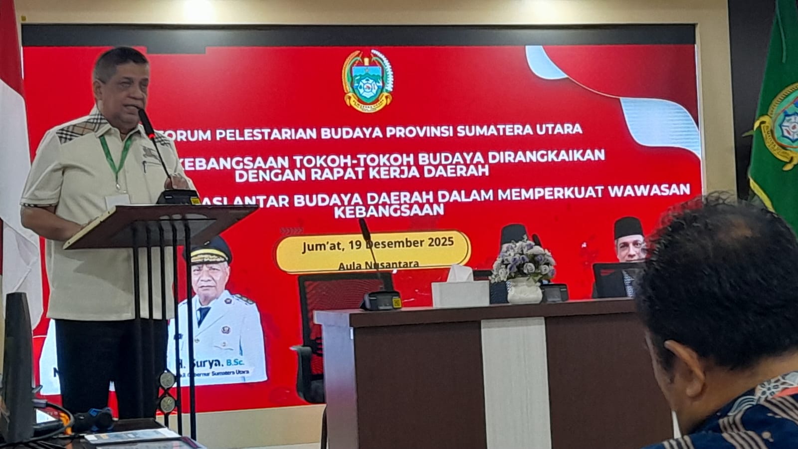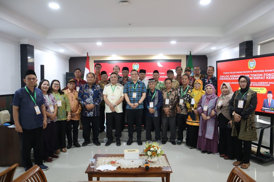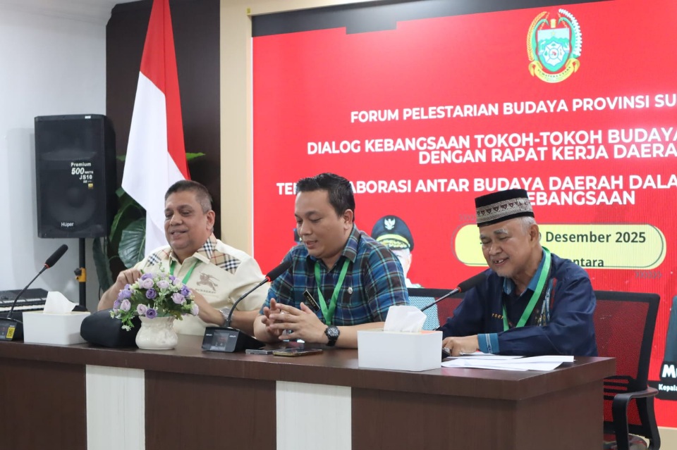 MEDAN : Forum Pelestarian Budaya Daerah (FPBD) Pemerintah Provinsi Sumatera Utara menggelar kegiatan “Dialog Kebangsaan Tokoh Tokoh Budaya” dengan tema “Kolaborasi Antar Budaya Daerah Dalam Memperkokoh Wawasan Kebangsaan” di Aula Nusatara Kantor Badan Kesatuan Bangsa dan Politik (Kesbangpol) Jalan Gatot Subroto Medan pada Jum’at 19 Desember 2025.