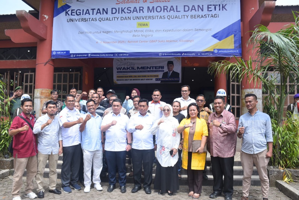 SIBOLANGIT : Seorang mahasiswa harus mampu memanfaatkan waktu belajar dengan sebaik-baiknya dan menjadikan kedisiplinan sebagai kunci utama menuju kesuksesan. Pesan ini disampaikan Wakil Bupati (Wabup) Deli Serdang, Lom Lom Suwondo SS dalam sambutannya, pada Pendidikan Dasar (Diksar) Moral dan Etik yang diselenggarakan Universitas Quality dan Universitas Quality Berastagi di Retreat Center GBKP Sukamakmur, Kecamatan Sibolangit, yang dihadiri oleh Wakil Menteri Desa, Pembangunan Daerah Tertinggal dan Transmigrasi (Wamendes PDTT), Ir H Ahmad Riza Patria MBA, Kamis (6/11/2025).