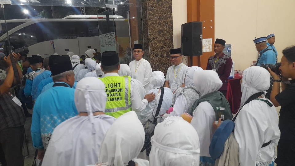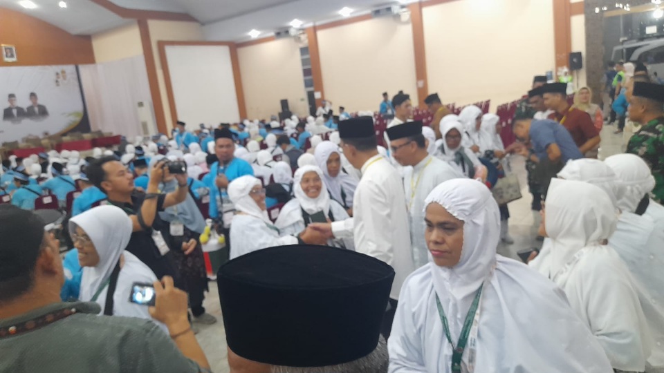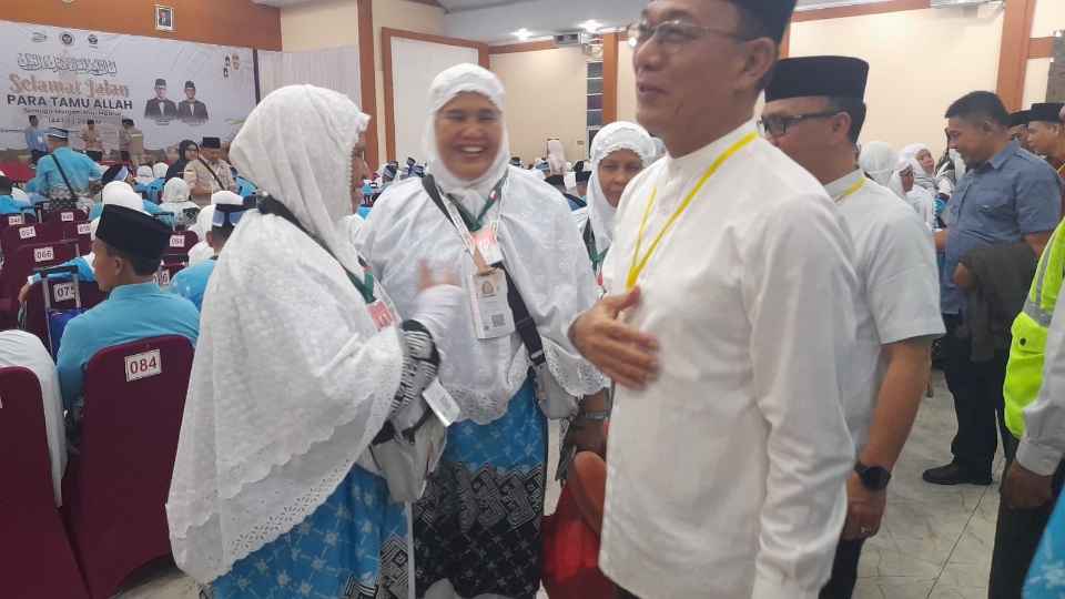 MEDAN : Rombongan jemaah haji asal Tapanuli Selatan kelihatan bersemangat dan bersenang hati dengan kehadiran bupatinya, Haji Gus Irawan Pasaribu melepas jemaah haji asal Tapanuli Selatan yang tergabung dalam kelompok terbang lima (kloter 5), Ahad (26/4/2026) di Aula Madinatul Hujjaz Komplek Asrama Haji Medan.