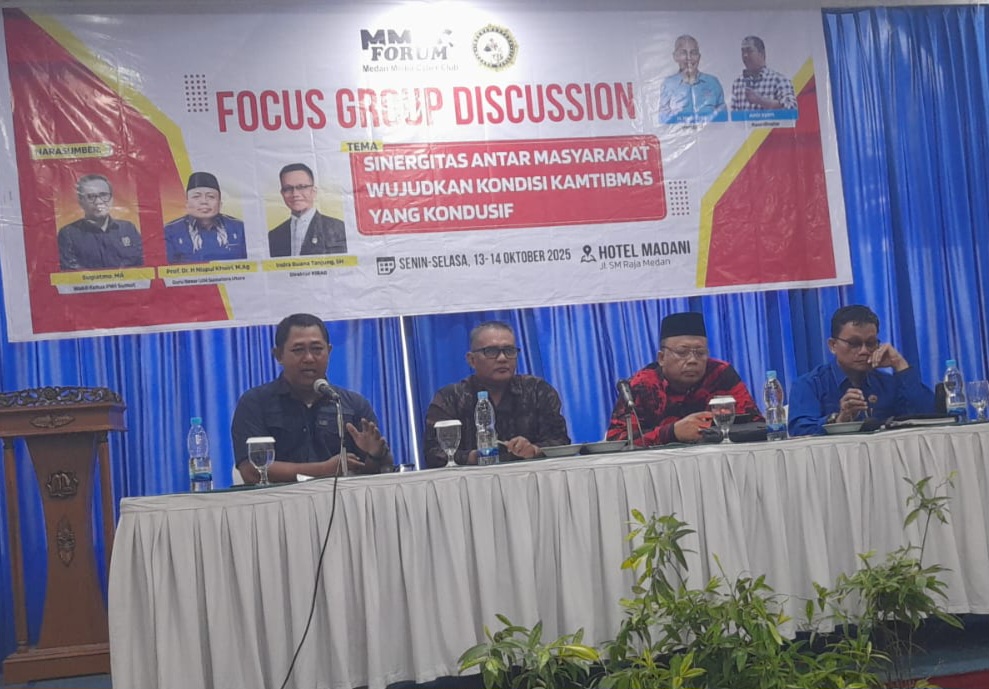 MEDAN :  Medan Media Cyber Club, sebuah organisasi kajian media menggagas sebuah FGD (Focus Group Discussion) bertema “Sinergivitas Antar Masyarakat Wujudkan Kondisi Kamtibmas Yang Kondusif, Selasa (14/10/2025) di Hotel Madani Medan. Tampil sebagai narasumber Prof. Dr. Nisful Khoiri, Sugiatmo, MA, dan Indra Buana Tanjung, SH dengan moderator Amirsyam.