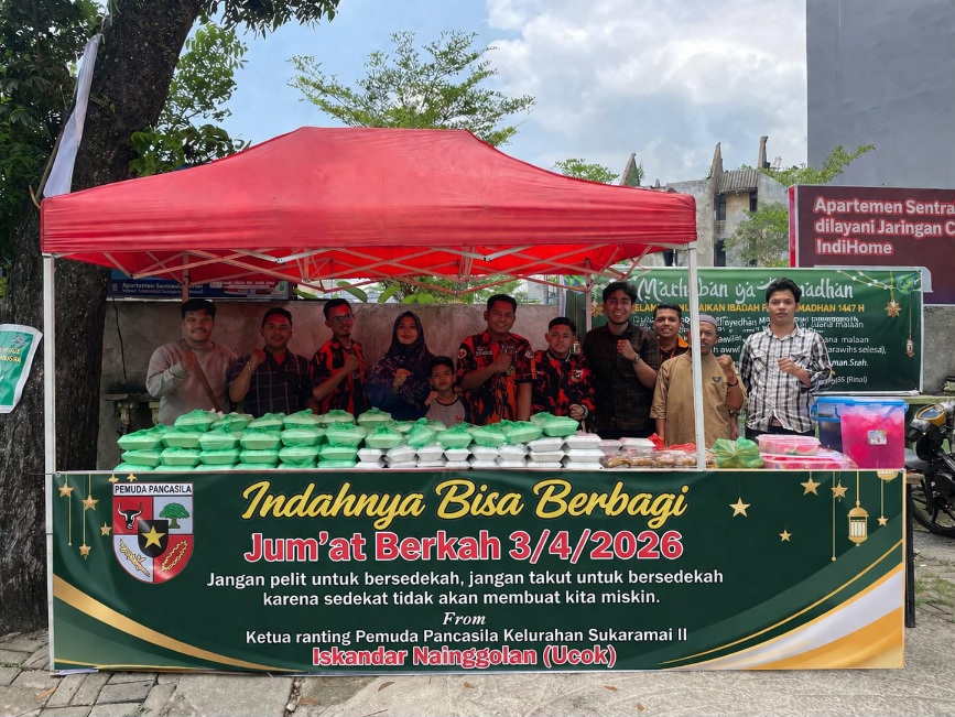 MEDAN : Pimpinan Ranting Pemuda Pancasila Kelurahan Sukaramai II, Kecamatan Medan Area, kembali menunjukkan kepeduliannya terhadap masyarakat melalui kegiatan rutin Jum’at Berkah yang digelar di Masjid Amal Silaturrahmi, Jalan Nikel, Jumat (3/4/2026). Kegiatan sosial ini merupakan agenda mingguan yang terus dijalankan sebagai bentuk nyata kehadiran organisasi di tengah masyarakat.