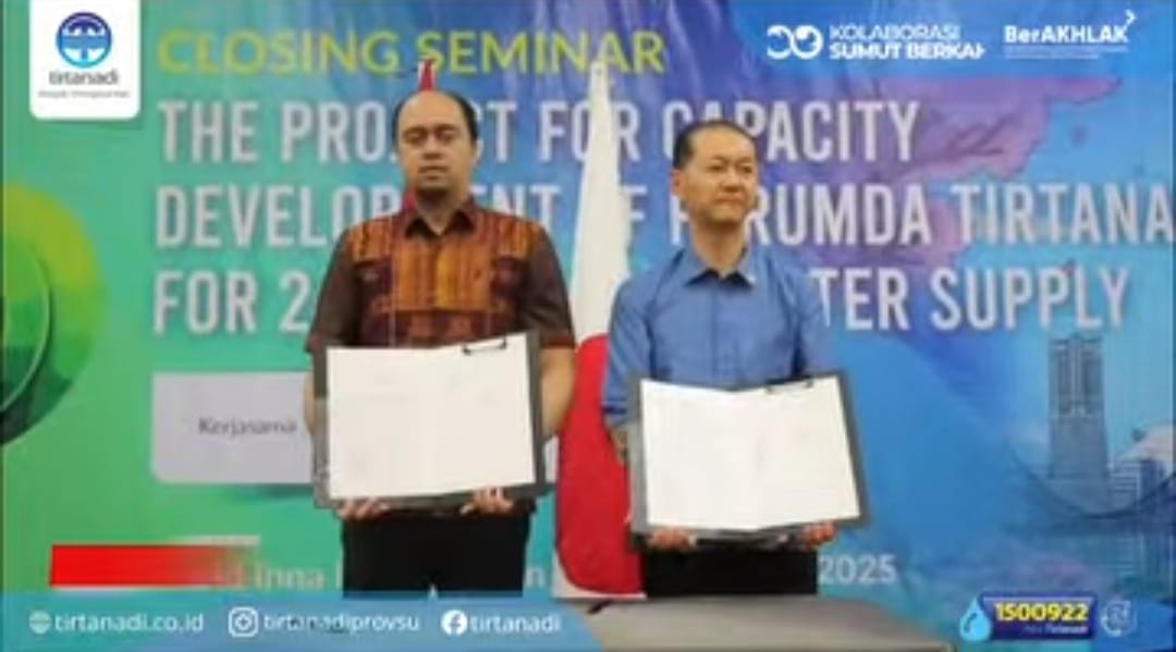 MEDAN : Perusahaan Umum Daerah (Perumda) Tirtanadi Provinsi Sumatera Utara secara resmi menutup rangkaian Program Kerja Sama Pengembangan Kapasitas Layanan Air Minum 24 Jam bersama Yokohama Waterworks Bureau (YWWB), Jepang. Penutupan tersebut ditandai dengan pelaksanaan Closing Seminar bertajuk “The Project for Capacity Development of PERUMDA Tirtanadi for 24 Hours Safe Water Supply” yang digelar di Ballroom Grand Inna Hotel Medan, Selasa (23/12).