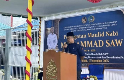 Kegiatan diawali dengan lantunan ayat suci Al-Qur’an oleh Nasrul Afdah Siregar, disusul sambutan Ketua Panitia, Aziz Indrajanus dan Kepala Rutan Evan Sembiring. Dalam sambutannya, Evan menegaskan bahwa peringatan Maulid Nabi bukan sekadar tradisi, tetapi wadah pembinaan keimanan dan akhlak mulia bagi warga binaan.