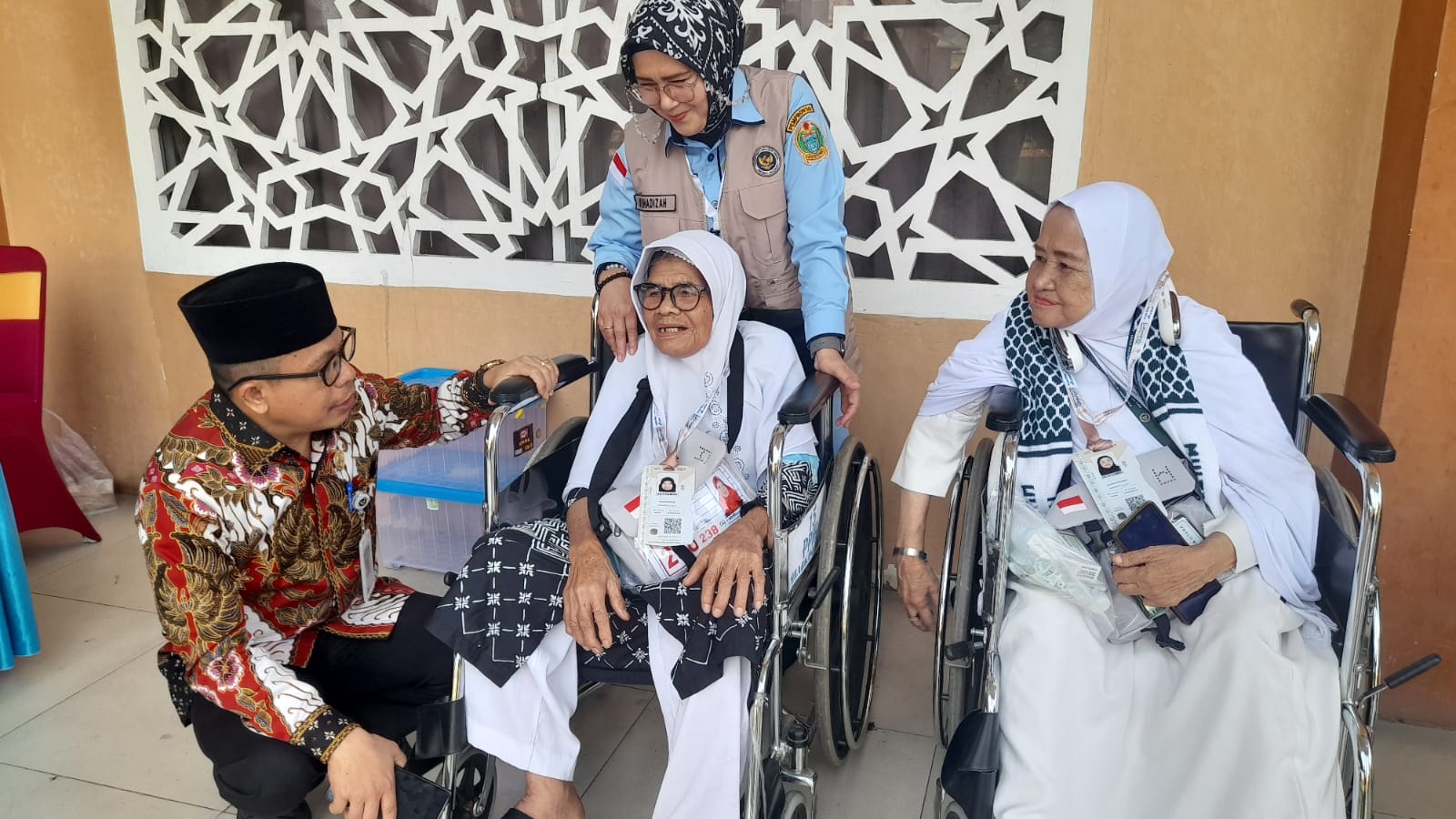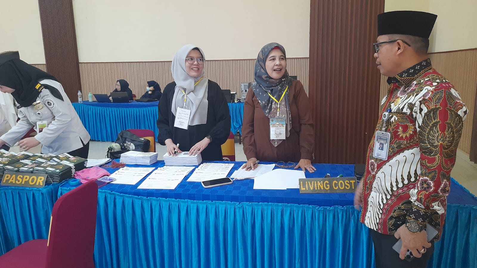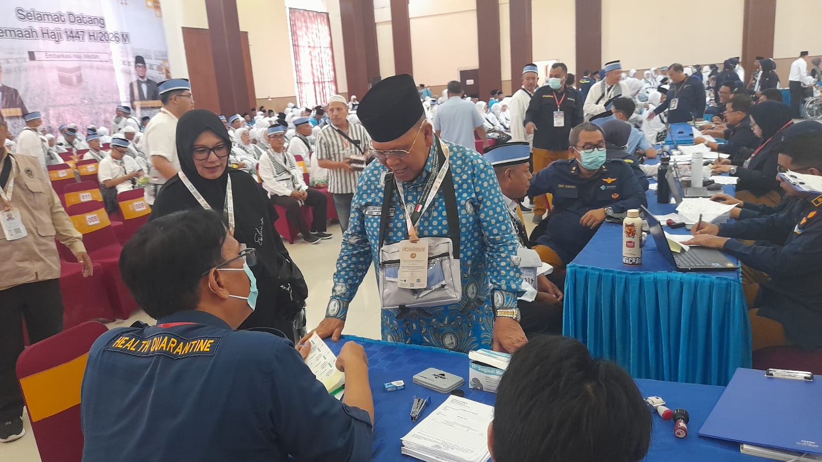 Usai memberikan sambutan kedatangan kepada jamaah haji Kloter 5, Zulkifli menyambangi para jamaah dan petugas yang sedang berproses saat menerima paspor, uang living cost, aktivasi kartu nusuq dan lainnya.